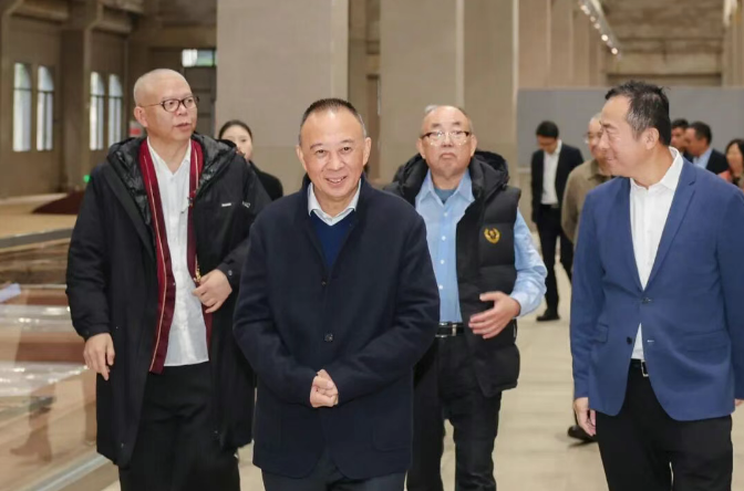 △2025郎酒重阳下沙大典隆重举行,郎酒集团董事长汪俊林(左二)、郎酒集团党委书记李明政(左一)与嘉宾一同前往酿酒车间体验重阳下沙工艺