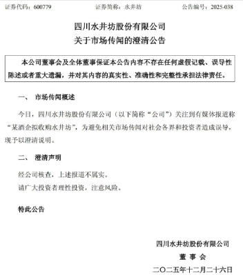 12月25日,多家媒体报道称,剑南春将收购水井坊,关于此传闻,当日晚间水井坊发布《水井坊关于市场传闻的澄清公告》。